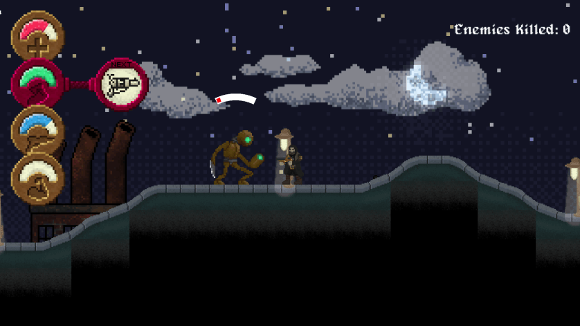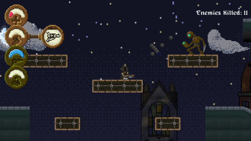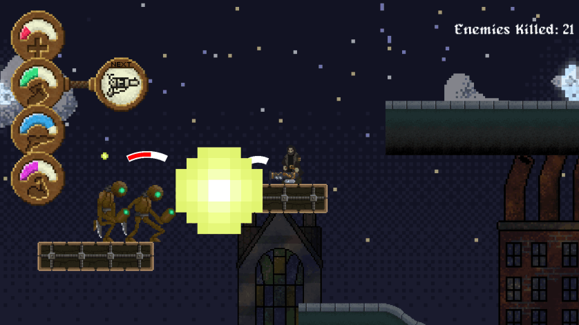 Designed core mechanic linking the character attributes to encourage mixed and strategic use - After a certain number of jumps, the player's weapon will swap to a new weapon - After a certain number of shots, the player's next jump will be boosted - After a certain number of enemies killed, the player's next weapon will be a supercharged mixture of all other weapons for a short duration