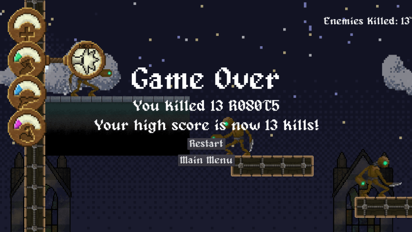 Managing initial scope is just as important as avoiding scope creep With the opportunity presented to make any game our group wanted, many of our ideas included complicated combat systems or multiple levels and worlds. Even once we had decided on the genre and base mechanics for Advanced Gunsuit: Technowars we kept adding different guns to make it fit the amount of content we initially dreamed of it having. As we reached the end of the jam, we ended up panic-scrapping levels to meet the deadline. Had we better managed our expectations for the initial scope of the game and kept the time limit in mind, we would have been less rushed at the end and ended up with a better game to present.